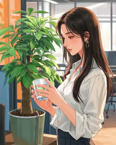 Tay tôi cầm cốc nước dừng lại giữa không trung, đột ngột quay đầu nhìn về phía góc văn phòng nơi có cây phát tài héo rũ đứng đó.