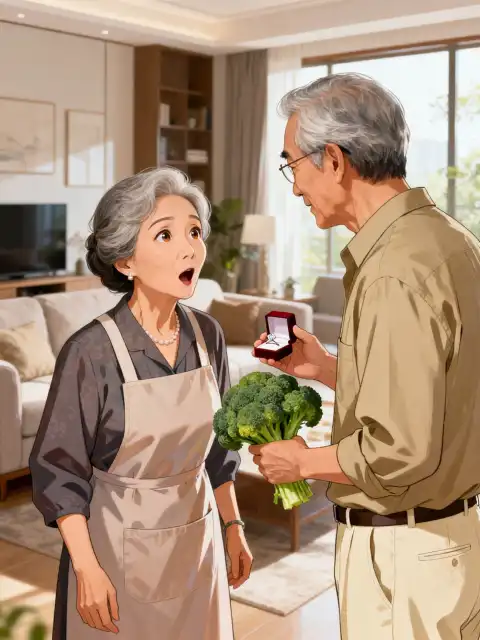 Nhìn Chu Phong quỳ gối trước mặt, cầm chiếc nhẫn moissanite 19,9 đồng m/ua trên Pinduoduo 9 đồng cùng bó bông cải xanh, tôi vội lùi lại một bước.